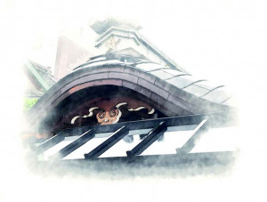 堀川通りに面する一の鳥居にはじまり、社殿の提灯や建物の瓦など境内の至るところで見ることが出来る晴明桔梗の紋。晴明公が創った陰陽道に用いられる祈祷呪符のひとつであり五芒星とも呼ばれる。「形が花を咲かせた桔梗に似ていることから名付けられました。晴明桔梗を陰陽道の社紋として使っておられるところは他に無いと思いますが、厄除けや身を守る印としてさまざまなところに用いられているんですよ。古くは明治時代の日本陸軍の帽頂部 、大阪城のお堀の東北隅にも密かに彫られているそう。三重県伊勢相差の海女さんが につける手拭や襦袢に記されるセーマンドーマンも有名ですね」。