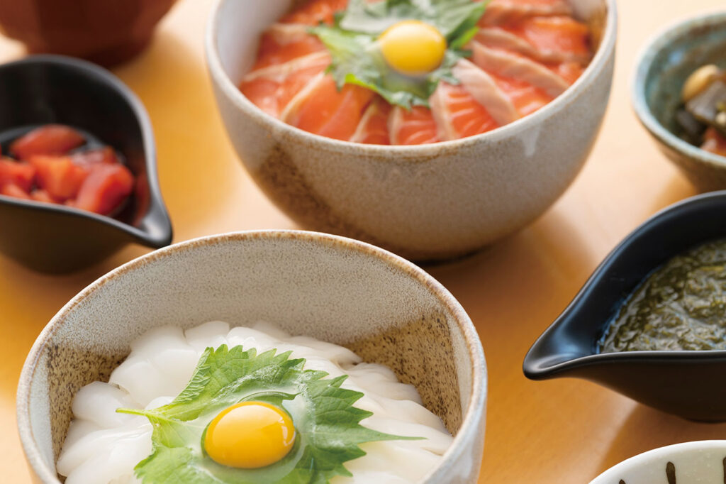 お食事処 濱の四季では ふくいサーモンをトマトダレで食べる「若狭の赤い海鮮丼」1700円、季節のイカを海藻のアカモクダレで食べる「若狭の白い海鮮丼」1600円