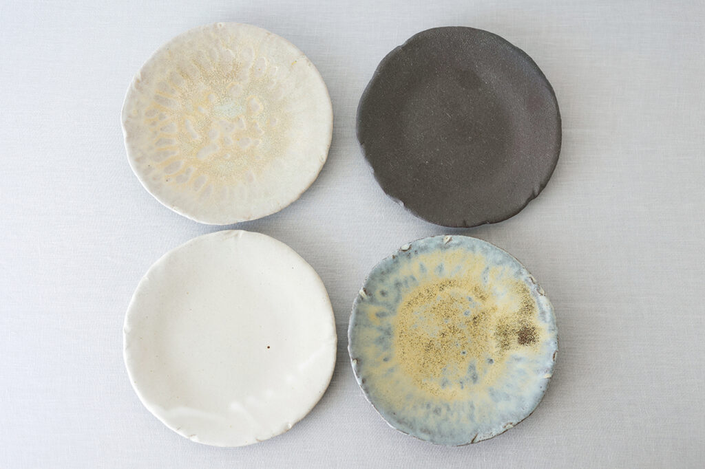 メインの料理の盛り付けにも活躍する7寸の丸皿。カレーやハンバーグ、パスタや餃子など、和洋中合わない料理がないくらい、どのメニューも引き立ててくれる。その理由は、丹後の土や植物の灰など、自然の素材を用いた釉薬を使うことで生まれる、やさしい色合いにあるのかも。宮津で暮らす秋鹿さん夫妻が、日々の暮らしの中で目にする、水、空気、光、土など、風景や自然から着想をえて生まれた色。丸皿は「朝霧」「水面」「消し炭」「雨空」の4色から選べ、見る角度で器の景色が変わり、使うシーンごとに違う表情をみせてくれる。