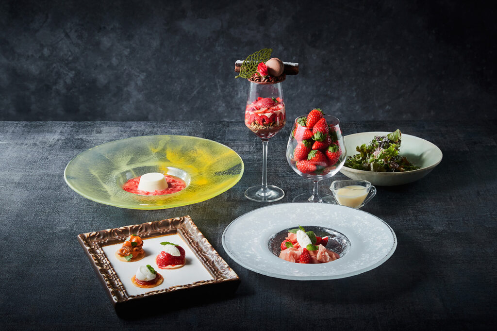 [At the Four Seasons Hotel Kyoto, Amao and other brand-name strawberries are lavishly used to create a variety of fresh, sorbet, jellied, and mousse flavors, allowing visitors to taste strawberries in different ways to suit their palates. Five types of sweets are available on the menu, which bring out the best of the ingredients, and four types of savory dishes express the fusion of various food cultures from around the world and Japanese strawberries. Enjoy them with the hotel's original tea blends, welcome drinks using strawberries, and original tea mocktails.