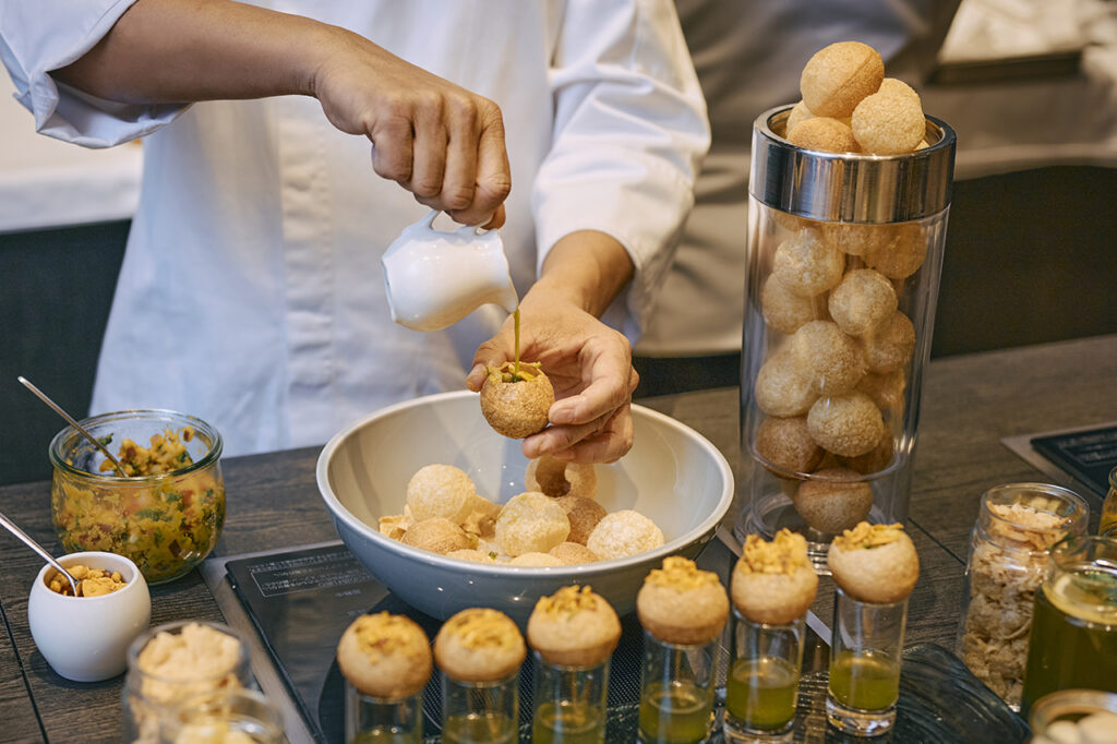 まず注目したいのが、シェフから直接料理を受け取れるライブステーション。ここで提供されるインドの「パニプリ」は、小さな揚げ生地の中にスパイシーな豆や香草を詰め、爽やかな酸味の“パニ”(スパイスウォーター)を注いだ一品で、パリパリの生地に注がれたパニをぱくっと一口で食べるのが本場スタイル。さらに、日替わりで登場する中東の伝統料理「ファラフェル」は、ひよこ豆に香草やスパイスを加えて揚げた、まるでヘルシーなコロッケのようなもの。豊かな香りも楽しめるファラフェルをピタパンに挟み、クリーミーなタヒニソースをかければ完成!