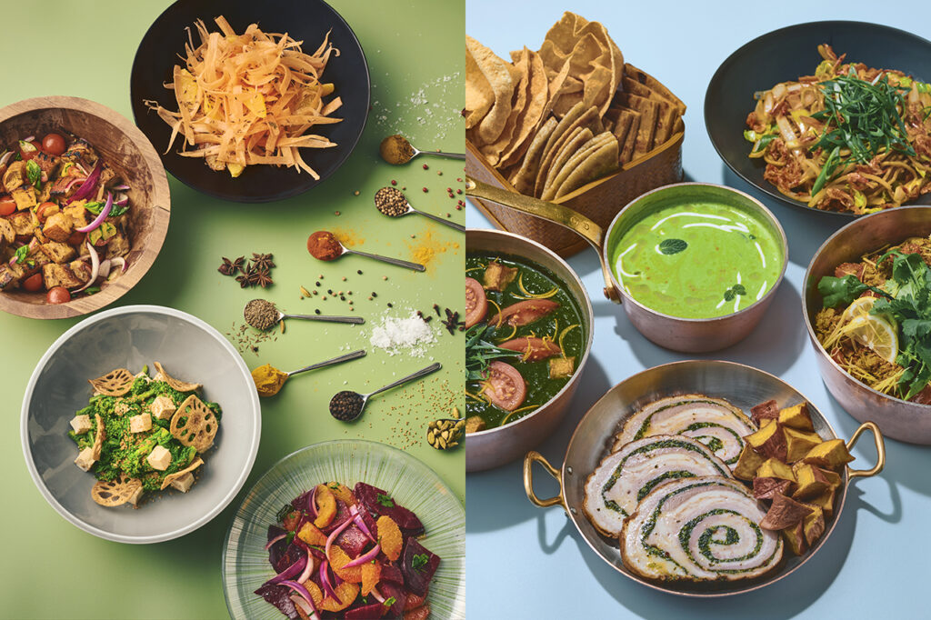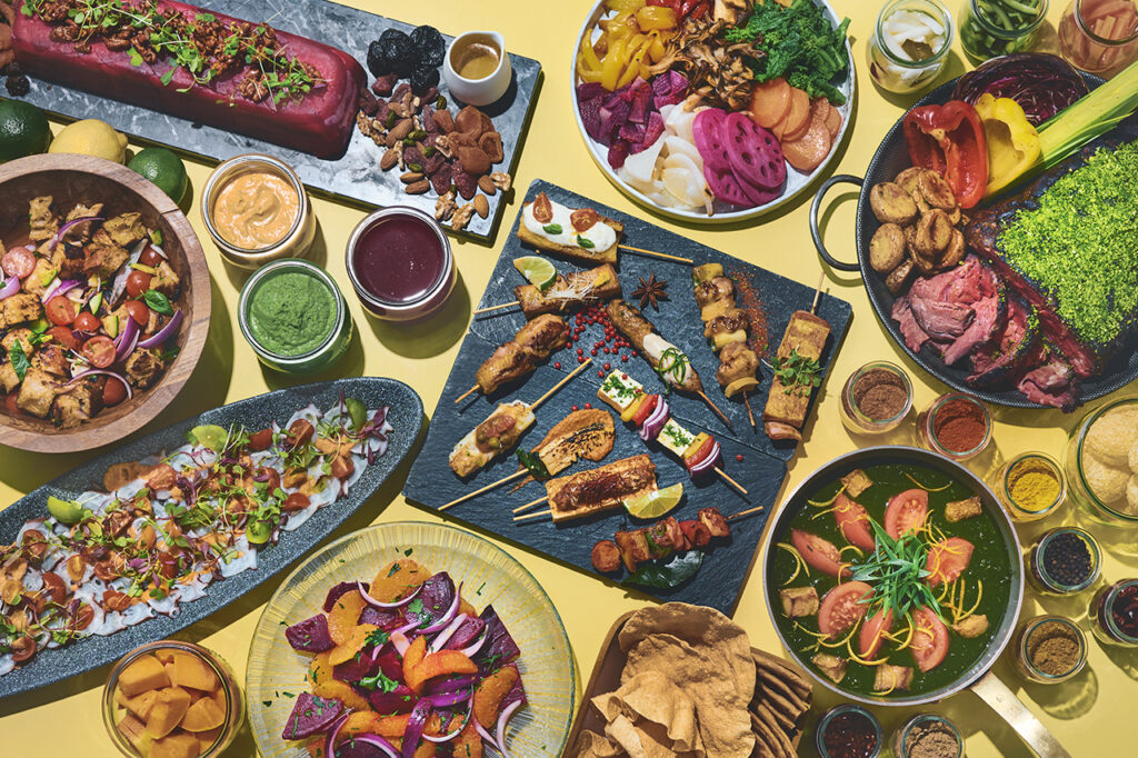 今回のビュッフェでは、世界の伝統料理に加えここでしか味わえない個性豊かなメニューがスタンバイ。注目の串料理はインドネシアの「サティ」やインドの「ティカ」などの世界の伝統的なものから、ポーク、チキン、豆腐、野菜をベースにしながら各国のエッセンスを取り入れたものまでバラエティ豊富にずらりと並ぶ。またカラフルな春野菜が主役の世界のサラダは、ドレッシングやスパイス、トッピングなど自由にカスタマイズができ、さらに世界の温かい料理を集めたホットセレクションには、約10種のスパイスを使用した「ベジタブルキーマ」やイタリア伝統の「ポルケッタ」などもラインナップ。世界の伝統料理やここだけのオリジナリティ溢れる料理の数々をぜひご賞味あれ。