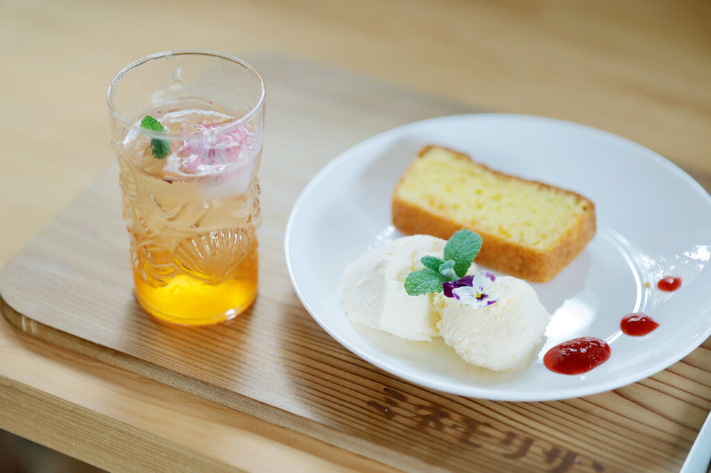 ランチセットのスイーツ&ドリンク。さくさくした歯触りの米粉のパウンドケーキが好評。甘酸っぱい花梨ソーダで爽やかな後味に