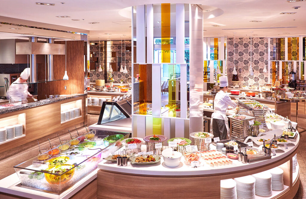 A buffet restaurant offering a wide variety and number of items for breakfast, lunch, and dinner. Dozens of hors d'oeuvres alone, main dishes, salads, soups, breads, fruits, ice cream, cakes, and many other items can be enjoyed at one time.