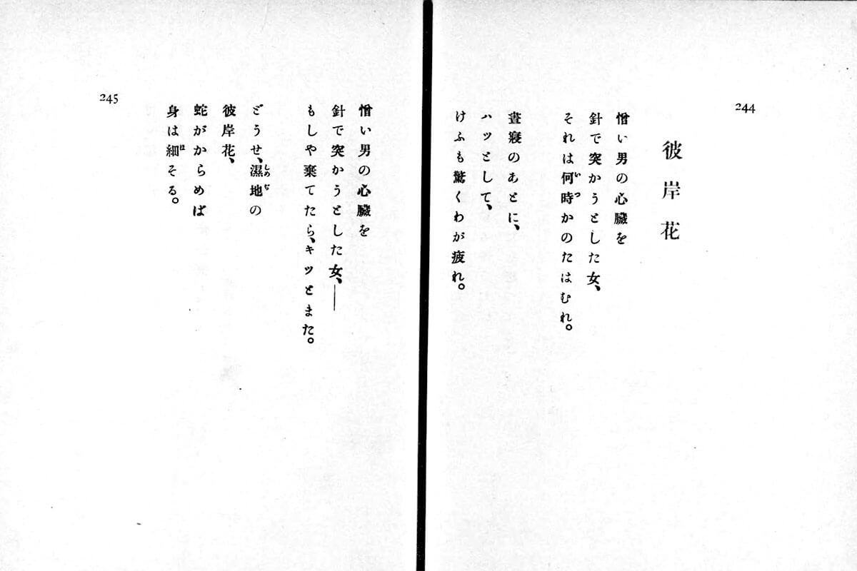 死人花(しびとばな)、幽霊花、地獄花、しびれ花、毒花、狐花……といった具合だ。曼珠沙華という呼び名だけは、仏教での天上の花、天界の花という神々しい意味である。こういった恐ろしげな呼び名は、花がよくお墓の傍に咲いていることや、その見た目や毒のせいだろう。緑のなかで一際赤く咲いている様子は艶やかだが、一方で毒々しくも、禍々しくも見える。