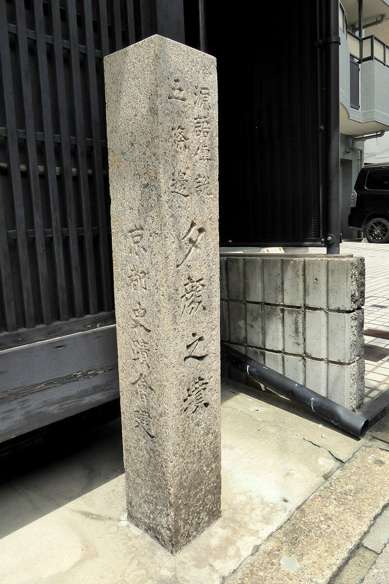 初夏の夕暮れに白い花を咲かせる、夕顔。「はかない恋」の花言葉を持つ、夕顔にまつわる石碑がある。前回、紹介した「鉄輪の井」から北へ、堺町通を200mほど上っていくと、風情ある民家の前に石碑が立っている。碑に刻まれた文字には、「源氏傳説 五条辺 夕顔之墳」とある。平安時代中期、紫式部によって書かれた王朝文学『源氏物語』。その登場人物で光源氏に愛された女人のひとり、「夕顔」の五輪塔がこの民家の庭あるという(公開されていない)。