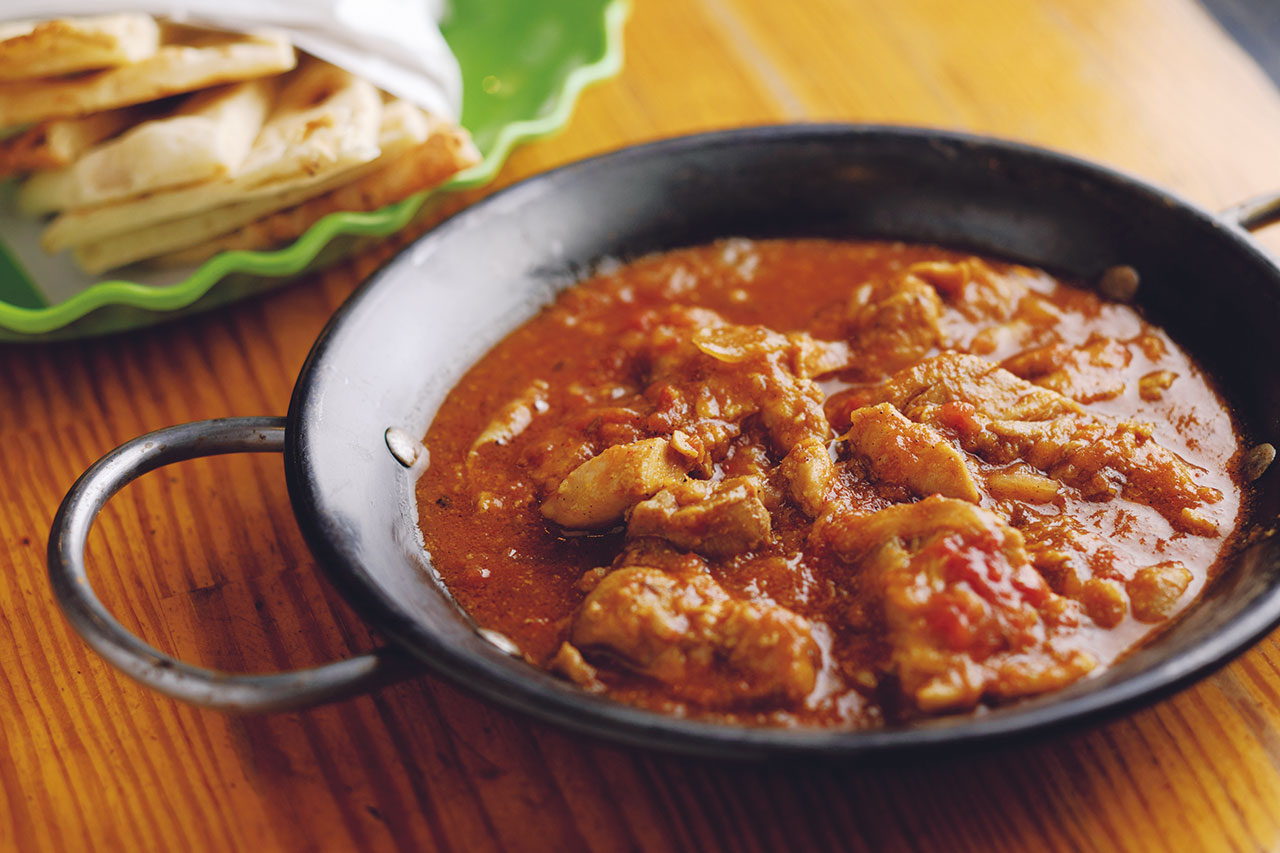 チキンバルチとナン8枚680円は、トマトとガラムマサラで煮込んだ、パキスタン北部のカレー。鶏肉ナンにのせてガブリ
