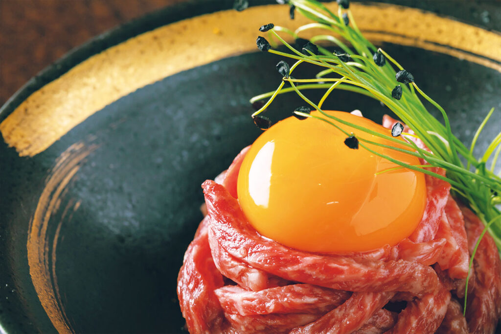 御所南にある[Teppan Dining Lʼajitto]プロデュースの焼き肉店。宮崎牛指定店に認定されており、高品質な宮崎牛が味わえるコースは8000円~。肉全体に散りばめられたキメ細かな霜降りがもたらすジューシーでやわらかな肉質と、芳醇なコクが魅力。牧場から直接一頭買いするため、希少部位の提供も可能とのこと。京町家を改装した和空間で大人の贅沢を堪能しよう。人気のユッケは1500円~。