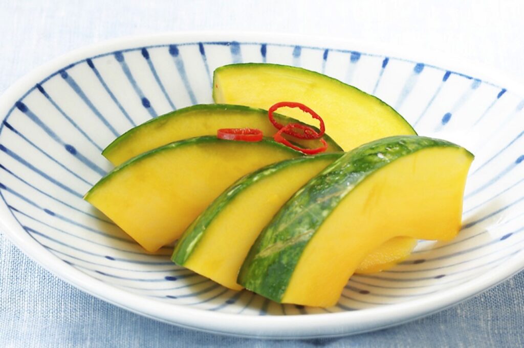 やさしい甘みで色合いも鮮やかな、かぼちゃ漬648円。パリパリとした食感も美味しさの一つ