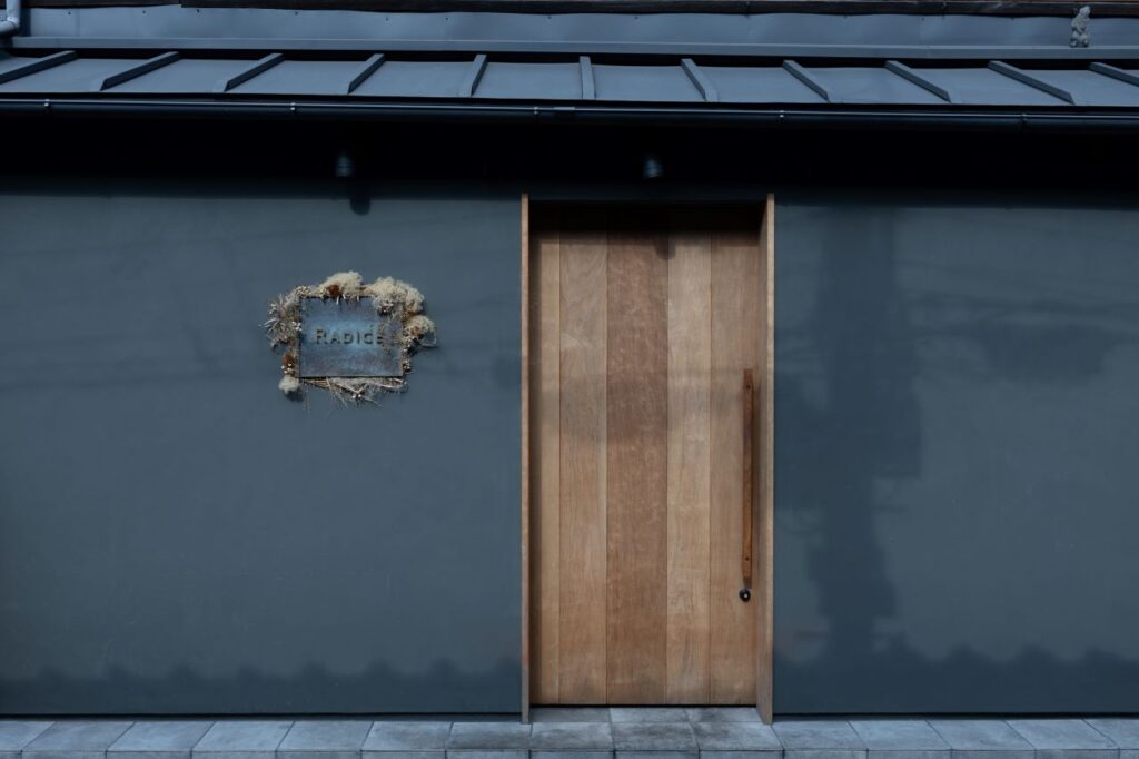 [京都御所]近くの落ち着いた街並みの中にある一軒が[RADICE](京都府京都市中京区)。グレイを基調とした和の佇まいで、ドライフラワーを纏ったおしゃれな表札が目印。根本シェフが繊細な手作業で作り上げる創作イタリアンを味わえる。